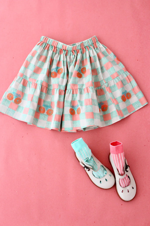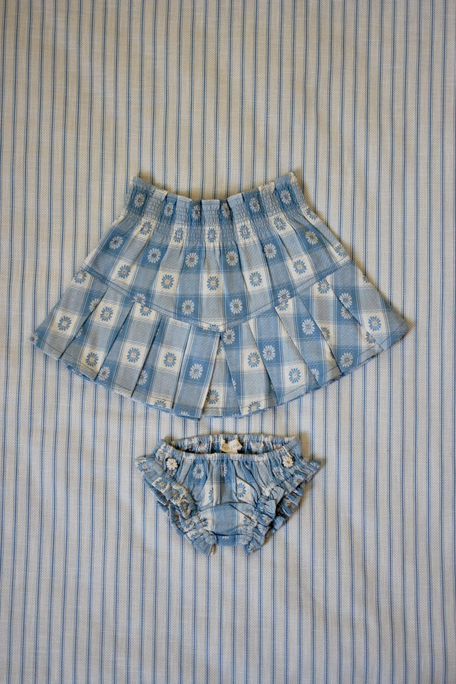Jupette plissée et culotte jacquard vichy fleurs bleu
