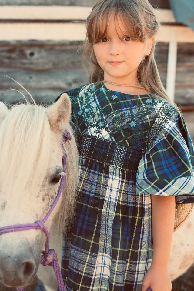 Jupette plissée et culotte jacquard vichy fleurs bleu